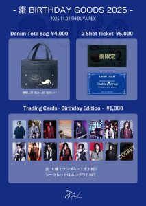 棗 Birthday Goods 販売決定! 11/2 渋谷REX公演にて販売開始! ◼︎ Denim Tote Bag ¥4,000 ◼︎ Trading Cards -Birthday Edition- ¥1,000 ◼︎ 2Shot Ticket ¥5,000 ※数量限定、無くなり次第終了