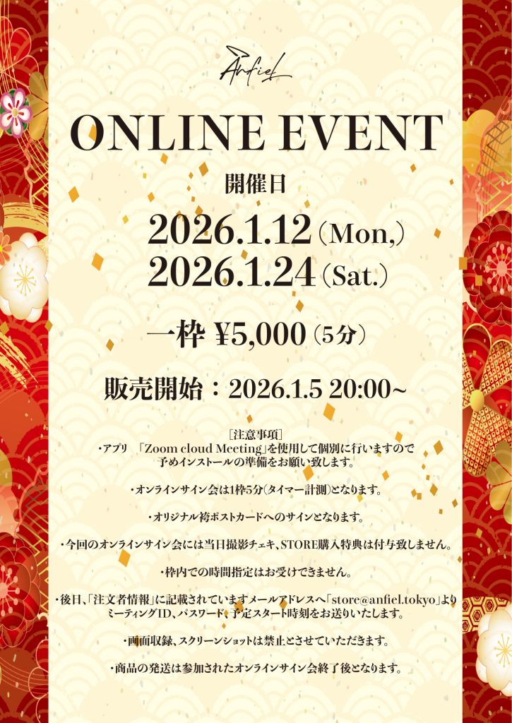 オンラインイベント開催決定! ▪️オンラインイベント [開催日程] 2025.12.03 (水) 2025.12.27 (土) [販売開始] 2025.11.26 21:00~ [販売ページ] http://anfiel.stores.jp